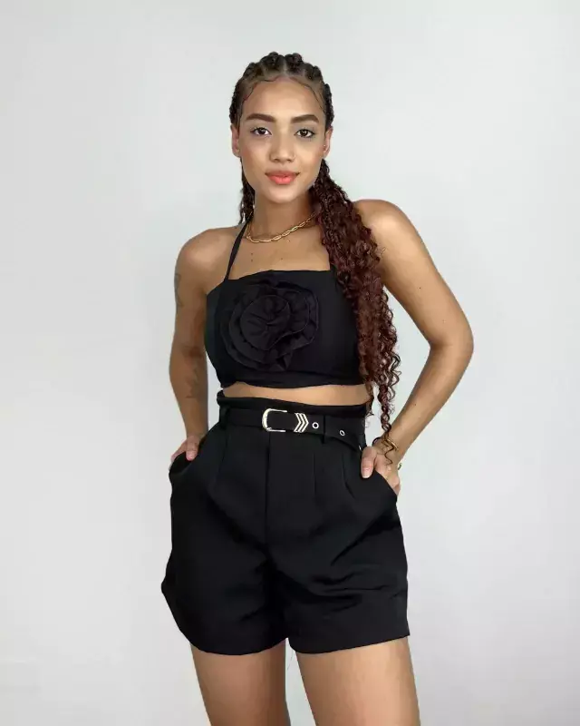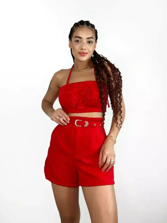 Conjunto Feminino em Alfaiataria Short com Cinto e Cropped Amarração com Flor Cláudia Ref. 1323